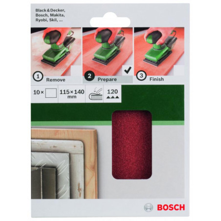 Emballage: 10Marque: BoschRéférence: 2609256B16EAN: 3165140615327Description: PONÇAGE MP (FEUILLE ABRASIVE 115X140MM, G100, RW, NON PERF., FIXATION ÉTRIER (10))