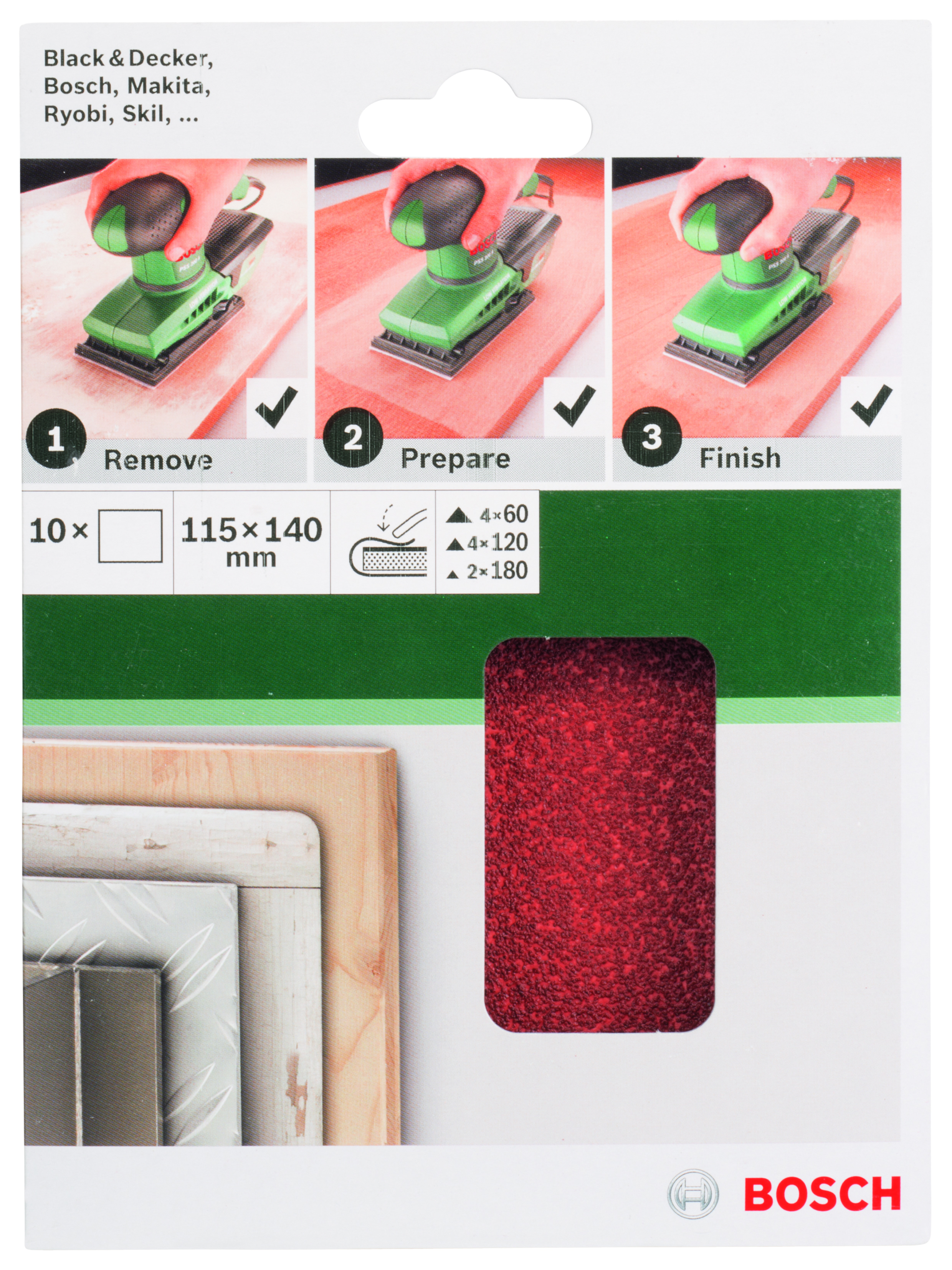 Description: PONÇAGE MP (FEUIILE ABRASIVE 115X140MM, 3XG60, 4XG100, 3XG150, RW, NON PERF., FIXATION ÉTRIER (10))