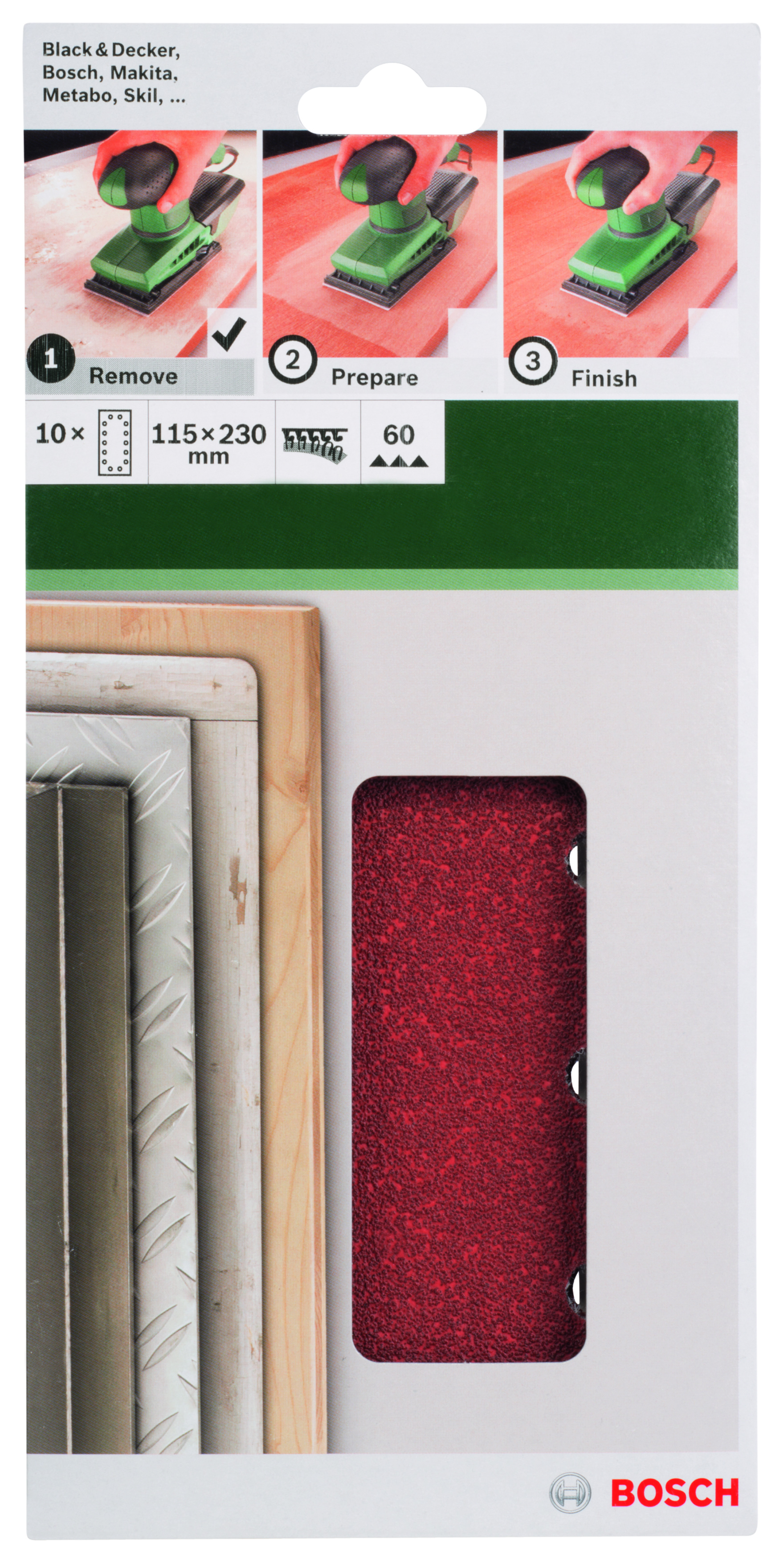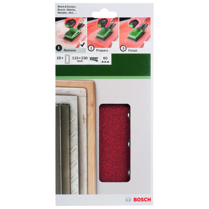 Emballage: 10Marque: BoschRéférence: 2609256B20EAN: 3165140615365Description: PONÇAGE MP (FEUILLE ABRASIVE 115X230 MM, G60, WOOD, 14 TROUS, VELCRO, (10))