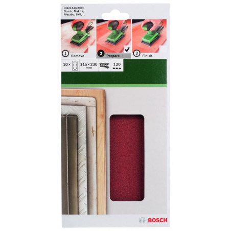 Emballage: 10Marque: BoschRéférence: 2609256B22EAN: 3165140615389Description: PONÇAGE MP (FEUILLE ABRASIVE 115X230 MM, G120, RW, 14 TROUS, VELCRO (10))