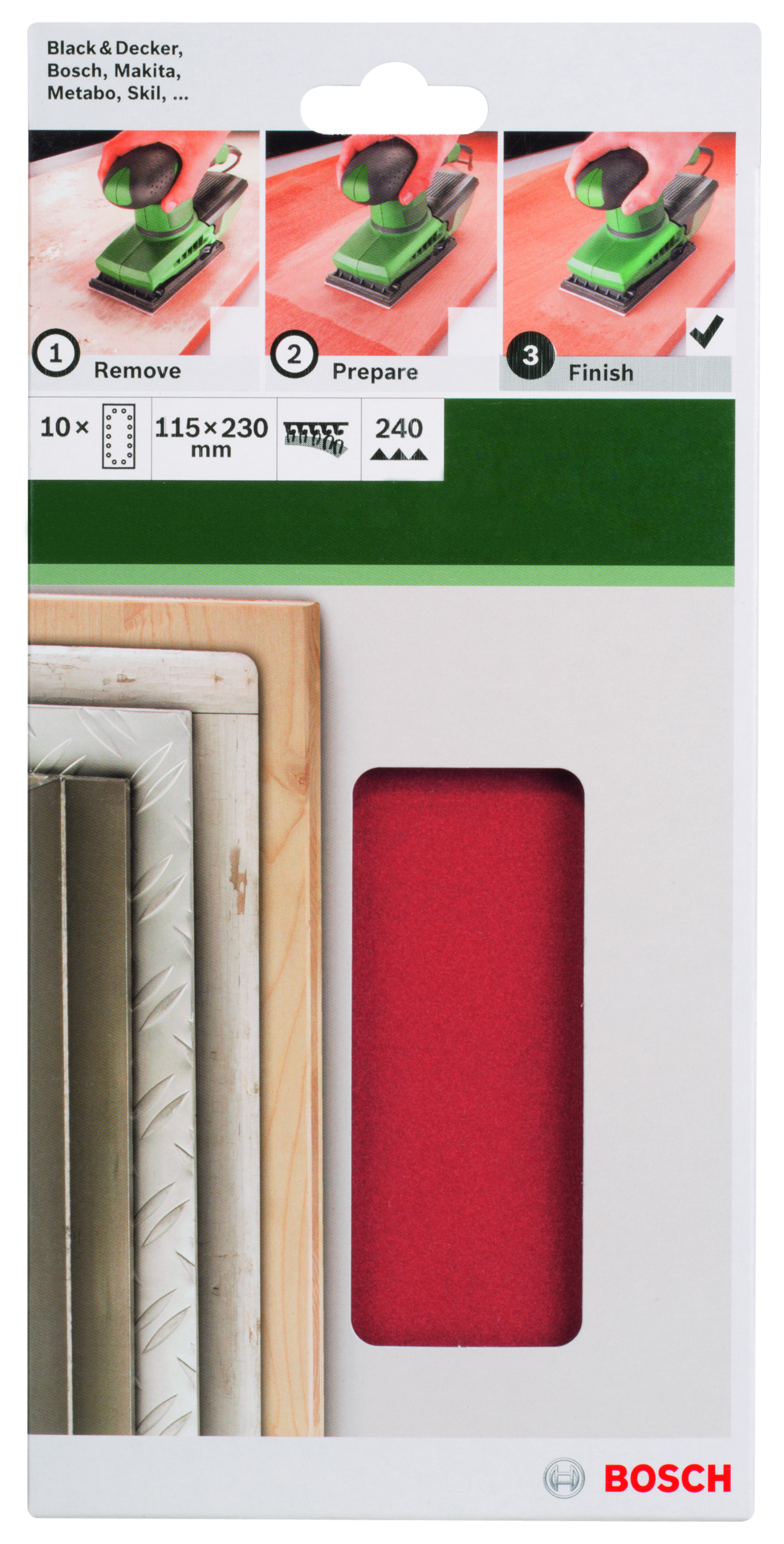 Emballage: 10Marque: BoschRéférence: 2609256B24EAN: 3165140615402Description: PONÇAGE MP (FEUILLE ABRASIVE 115X230 MM, G240, WOOD, 14 TROUS, VELCRO, (10))