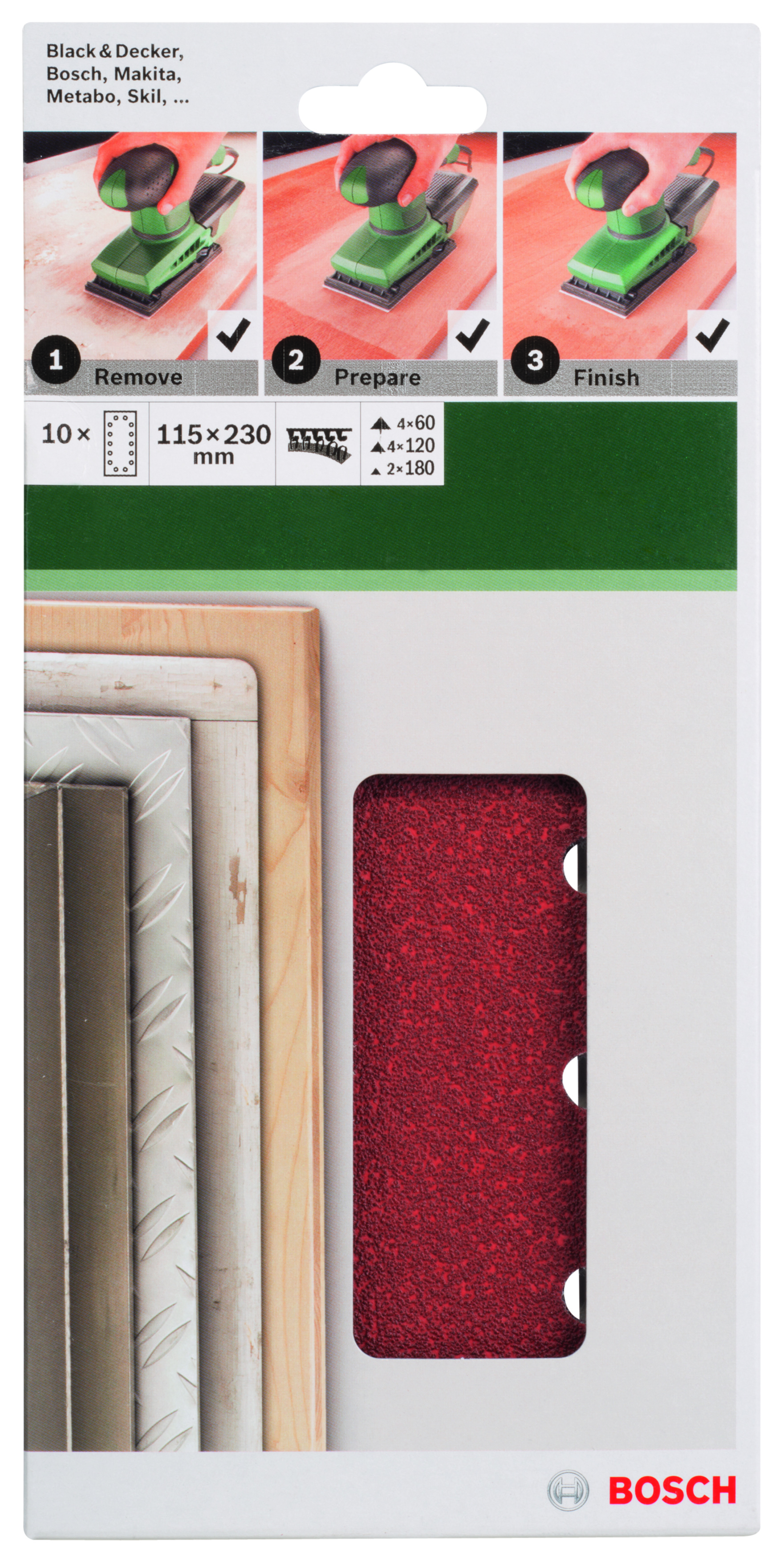 Emballage: 10Marque: BoschRéférence: 2609256B25EAN: 3165140615419Description: PONÇAGE MP (SET FEUILLE ABRASIVE 115X230 MM, RW, 14 TROUS, VELCRO (10))