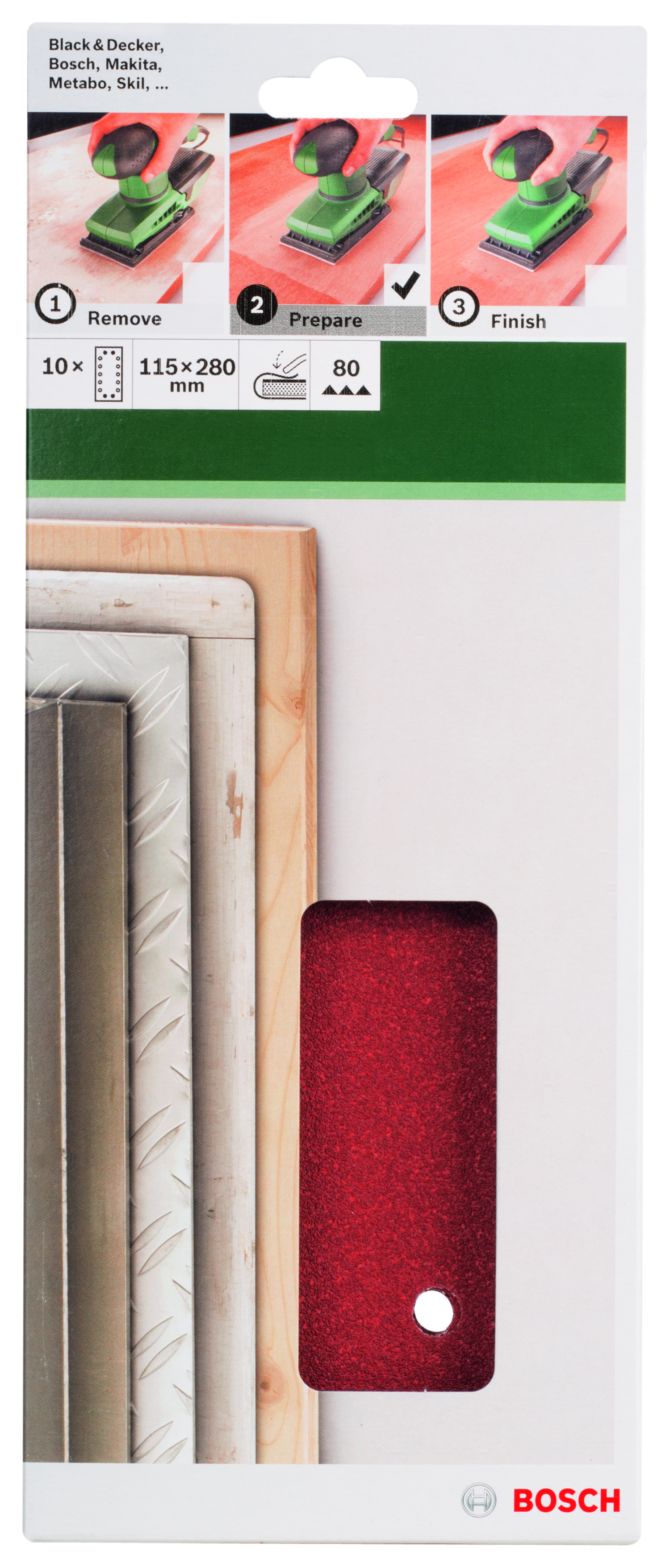 Emballage: 10Marque: BoschRéférence: 2609256B28EAN: 3165140615440Description: PONÇAGE MP (FEUILLE ABRASIVE 115X280 MM, G80 , RW, 14 TROUS, FIXATION ÉTRIER (10))