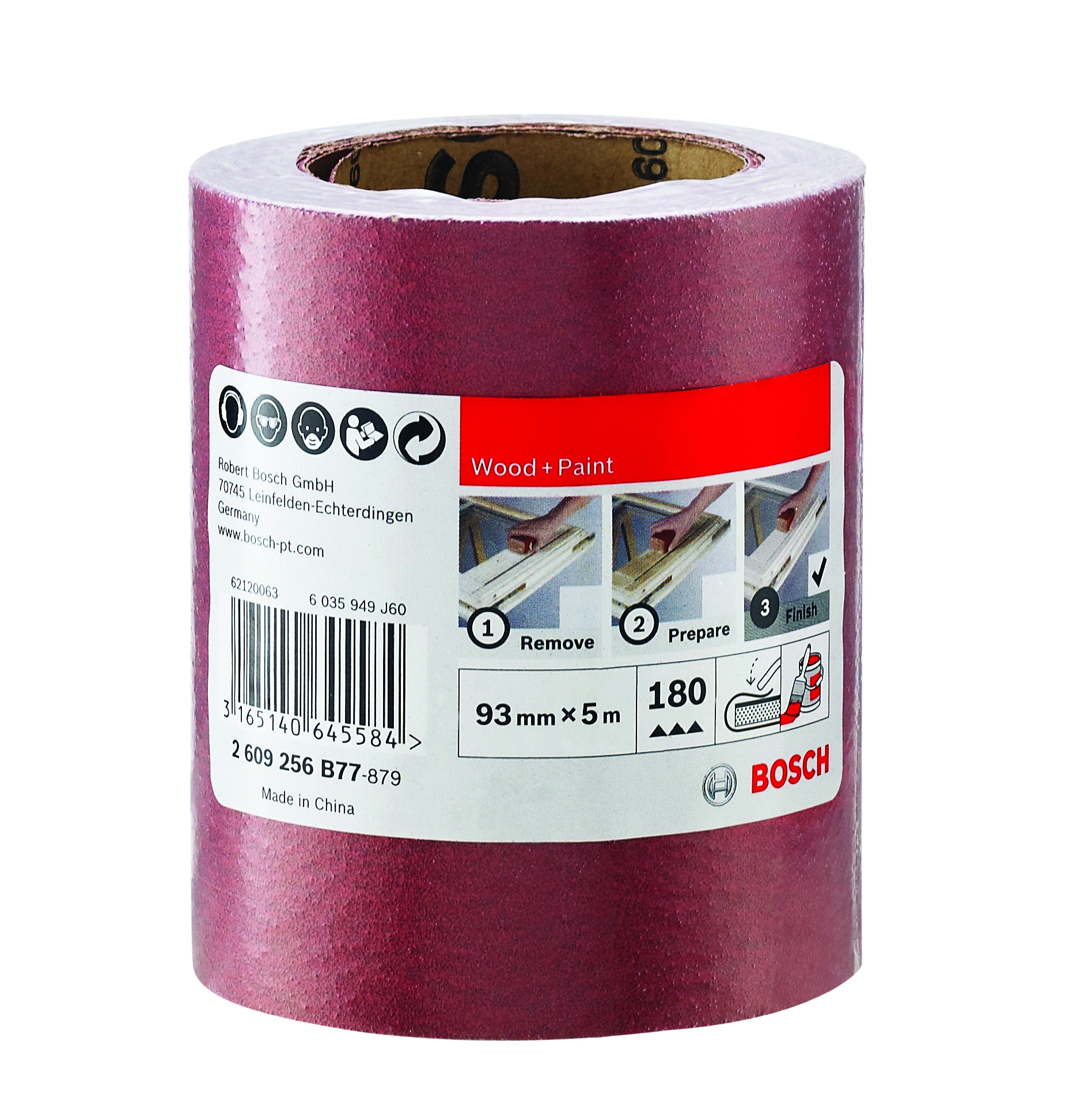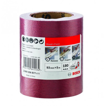 Emballage: 1Marque: BoschRéférence: 2609256B77EAN: 3165140645584Description: PONÇAGE MP (Rouleaux d`abrasif bois 93mmx5m K180)