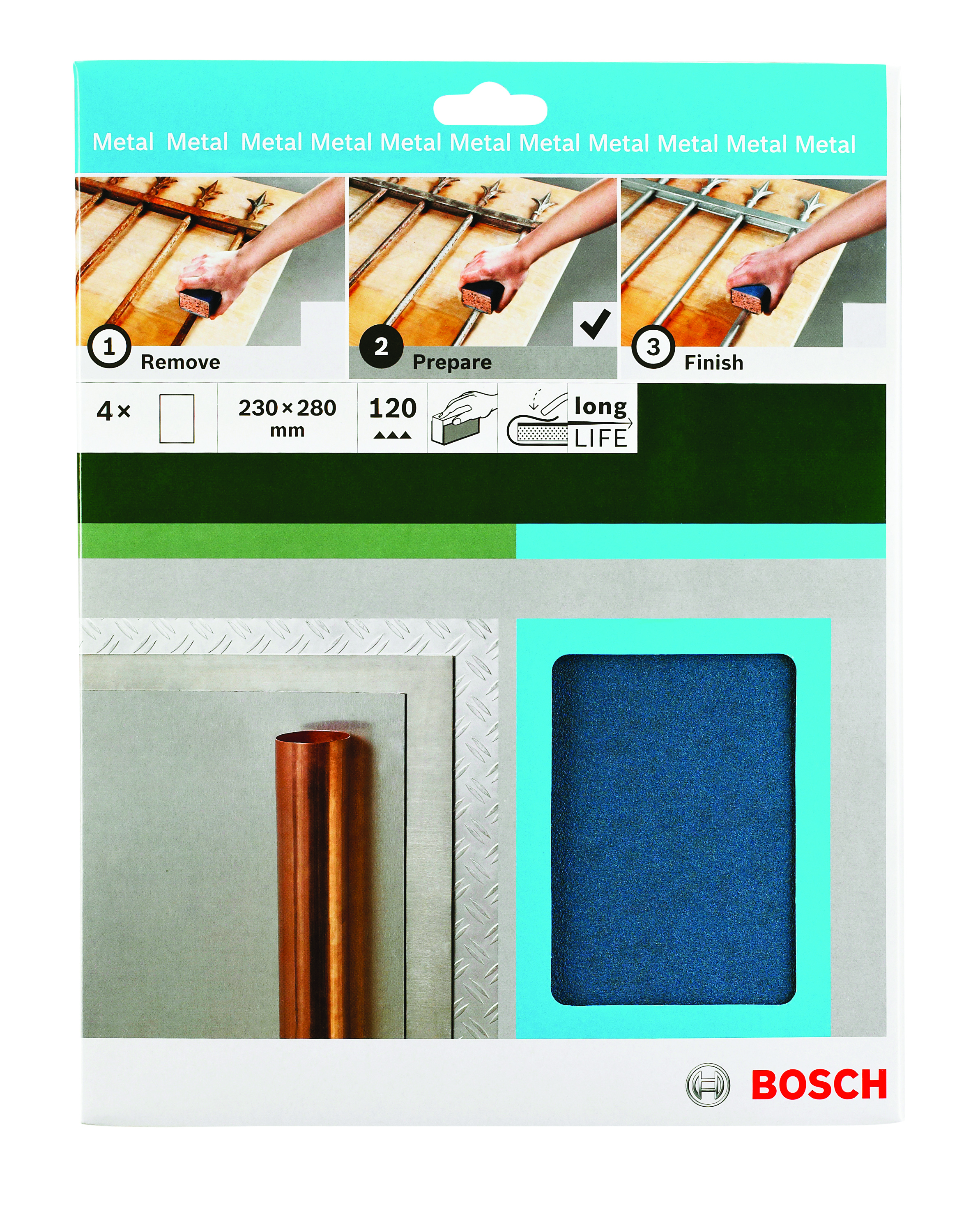 Emballage: 1Marque: BoschRéférence: 2609256C42EAN: 3165140646239Description: PONÇAGE MP (Feuille abrasive à main métal 230x280mm K120 (4))