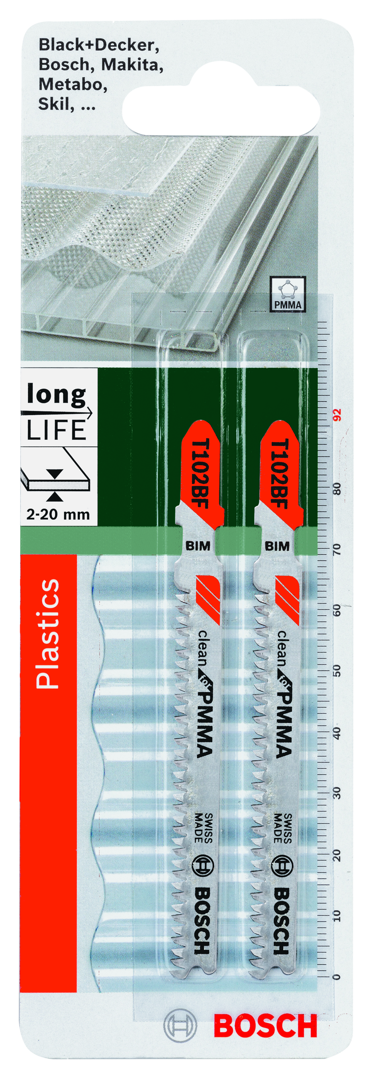 Emballage: 2Marque: BoschRéférence: 2609256C59EAN: 3165140691635Description: LAMES SCIES SAUT./EGOÏNE MP (LAME DE SCIE SATEUSE T102BF, CLEAN FOR PMMA (2))