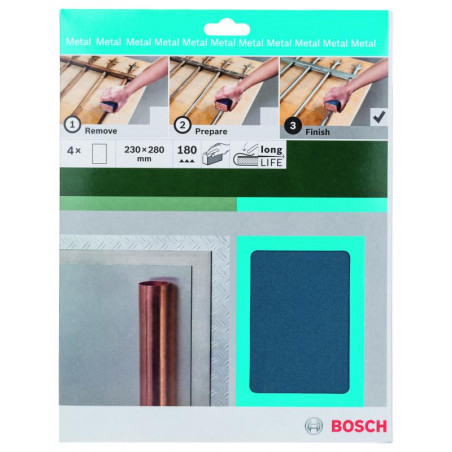 Emballage: 4Marque: BoschRéférence: 2609256C68EAN: 3165140735377Description: PONÇAGE MP (Feuille abrasive à main métal 230x280mm K180 (4))