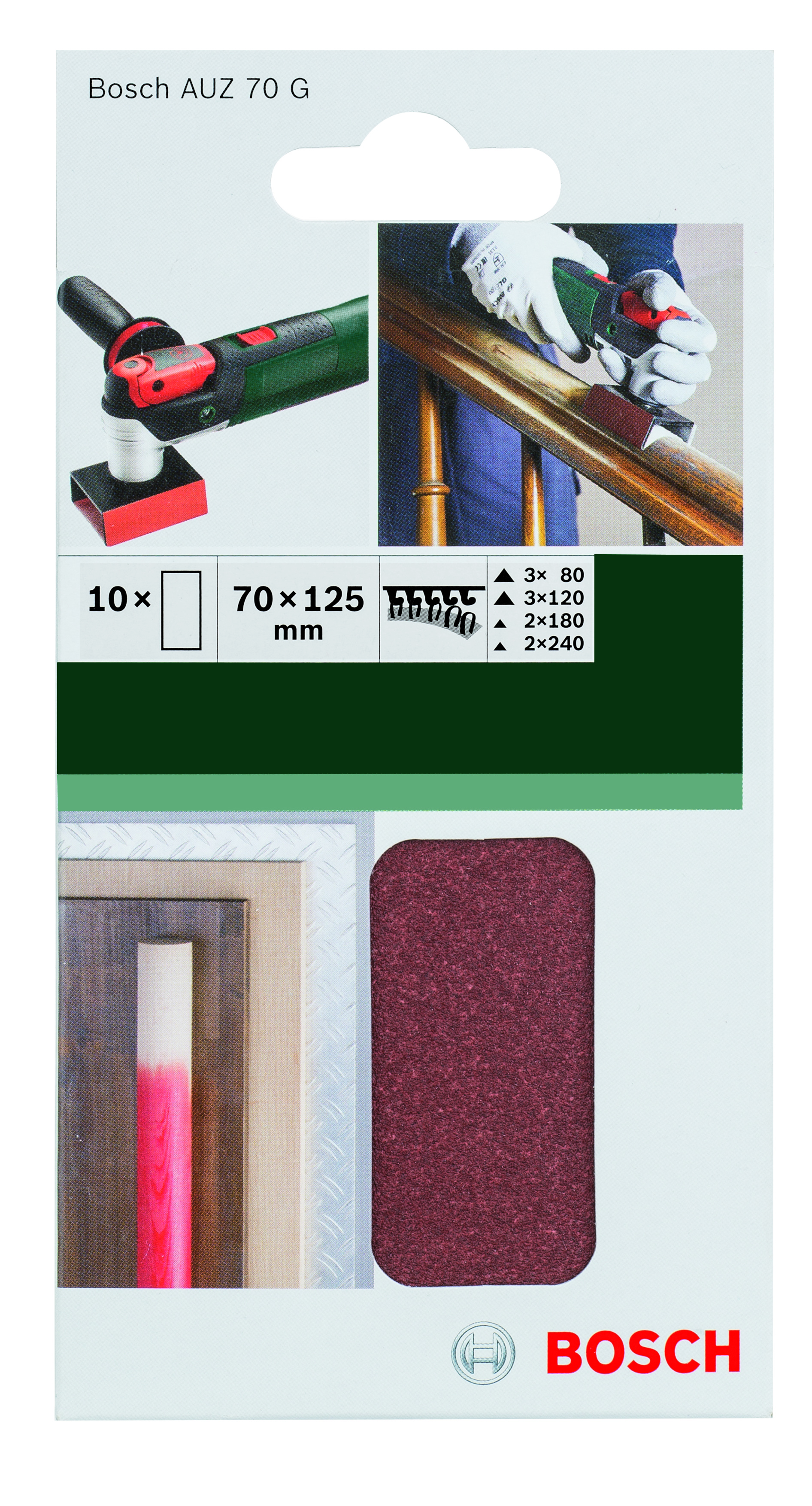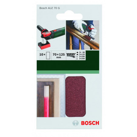 Emballage: 10Marque: BoschRéférence: 2609256D33EAN: 3165140801409Description: PONÇAGE MP AUZ 70 G (Set de 10 feuilles abrasives pour plateau de ponçage auz 70G)