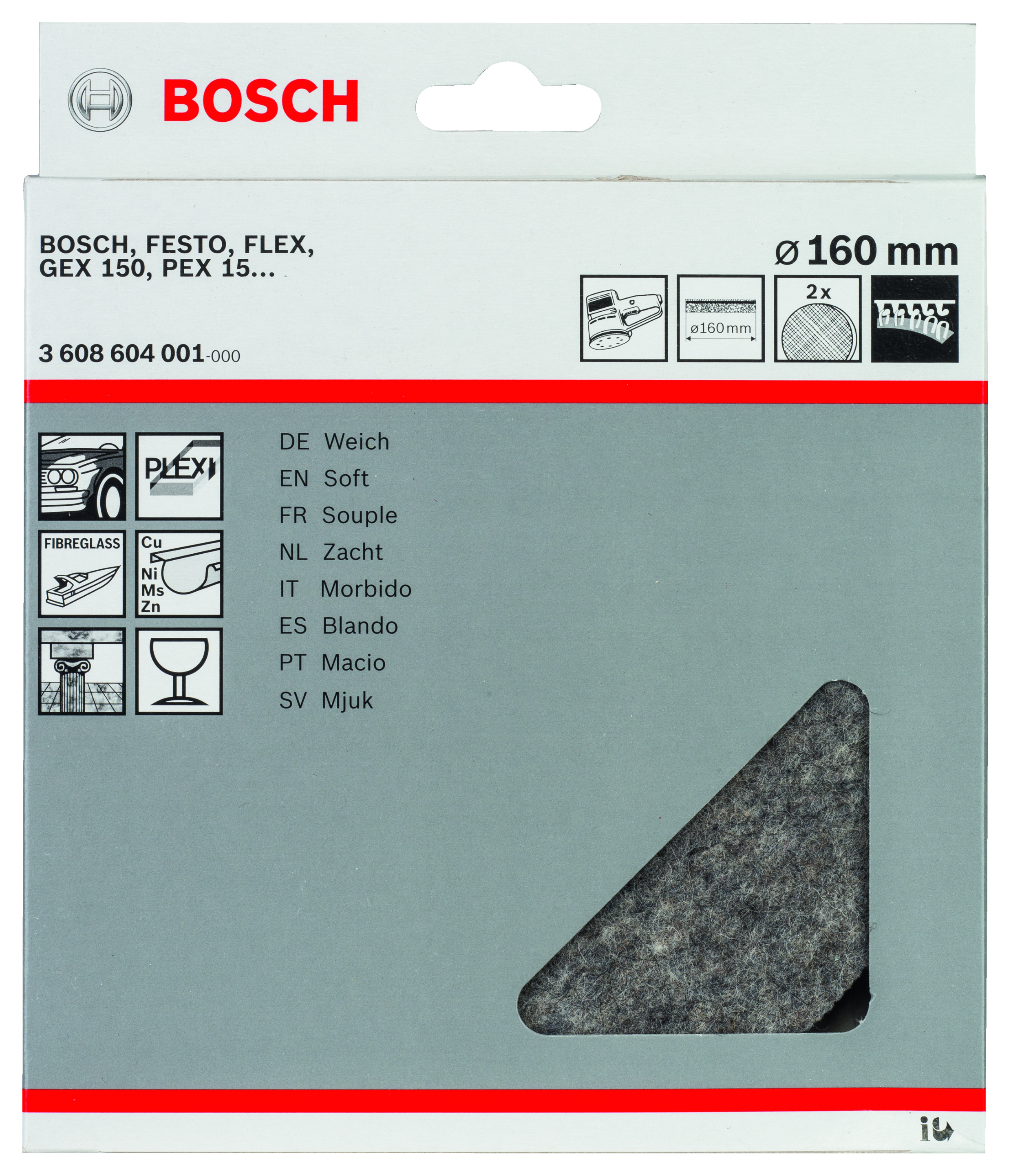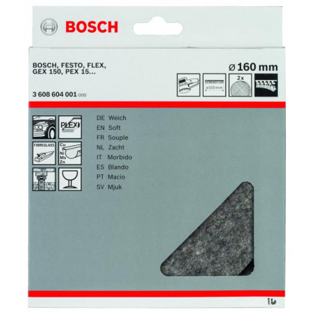Emballage: 2Marque: BoschRéférence: 3608604001EAN: 3165140018784Description: Feutre à polir souple GEX 150, 160 mm 2x