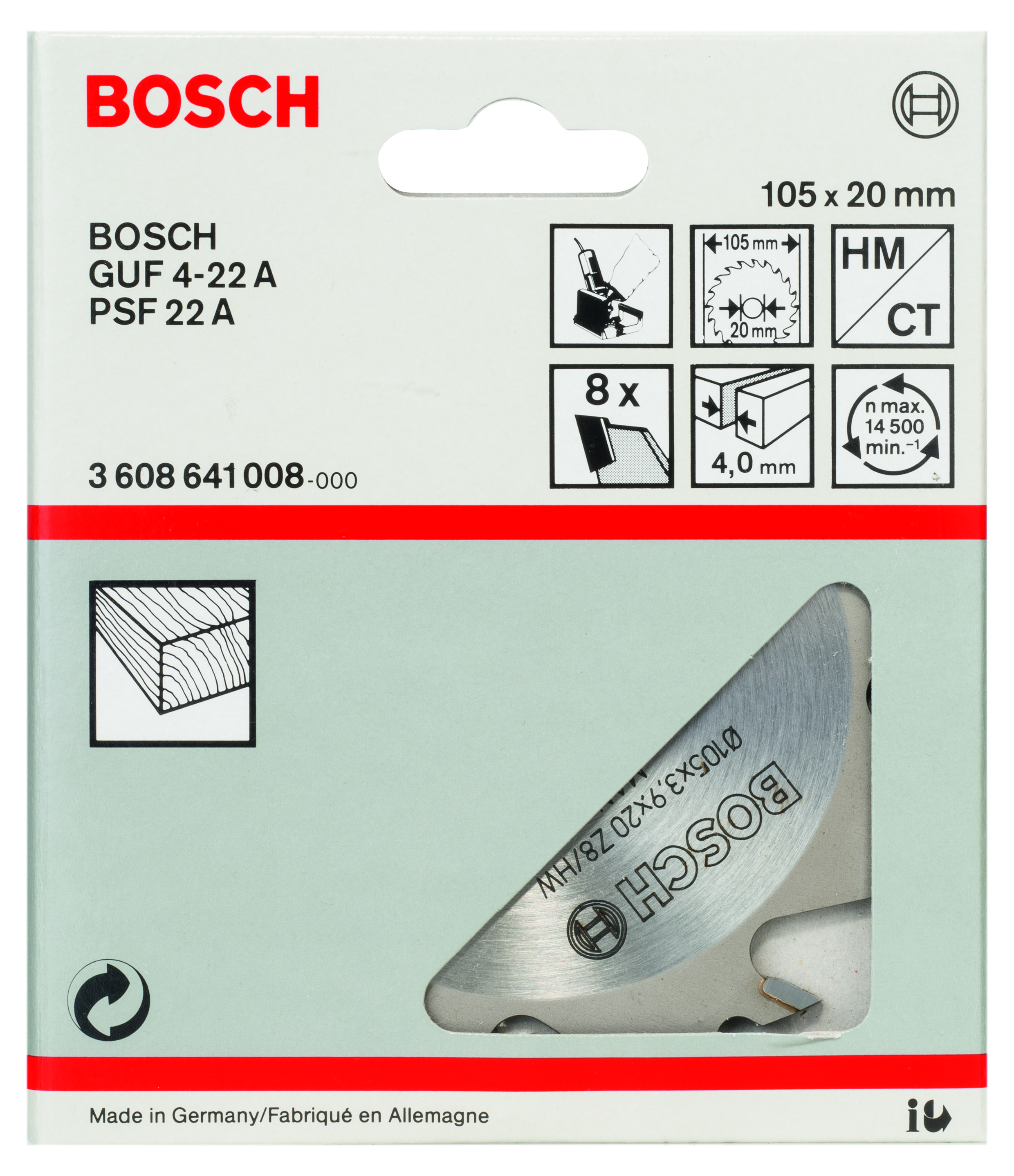 Emballage: 1Marque: BoschRéférence: 3608641008EAN: 3165140013802Description: Fraise circulaire 8, 20 mm, 4 mm