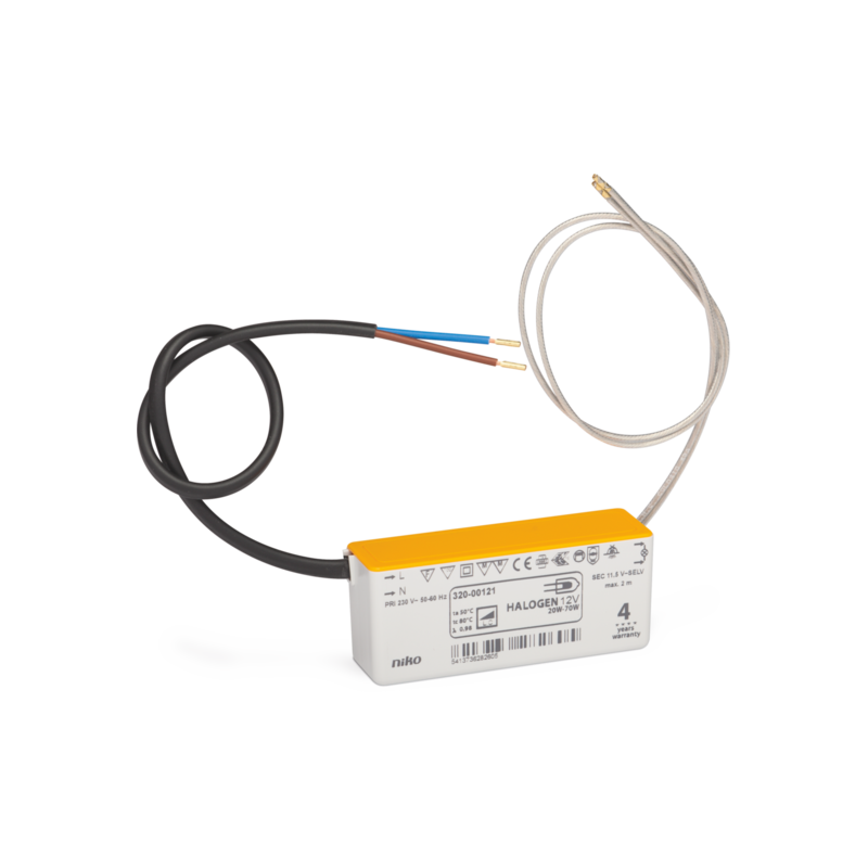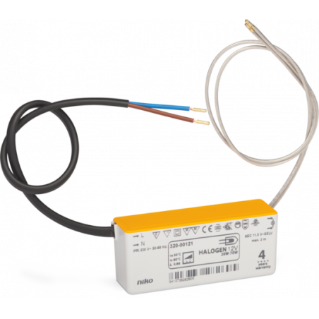 Description: Transformateur électronique compact de 70 W avec raccordements filaires du côté primaire et du côté secondaire (non coulé)