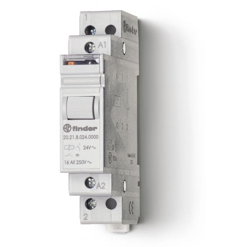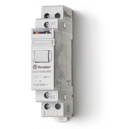 Description: Télérupteur modulaire interrupteur unipolaire 1NO 16A 24V DC, bouton test et indicateur mécanique, matériau des contacts AgSnO2