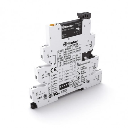 Description: Interface modulaire à relais statique masterTIMER 1NO 6A entrée : 24V AC/DC, Sortie : 24V DC, 4 plages de temporisation, 8 fonctions, étrier plastique de maintien, largeur 6,2mm, option porte-fusible, bornes à cage