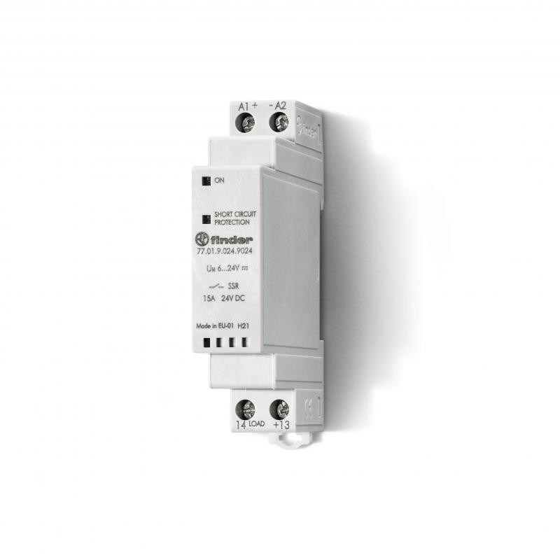 Description: Relais statique modulaire 1NO 15A 24V AC/DC, tension nominale de sortie 24V DC, bornes à cage disposées sur les cotés opposés ''type relais'', commutation sans arc ni rebond au zéro de tension, largeur 17,5mm
