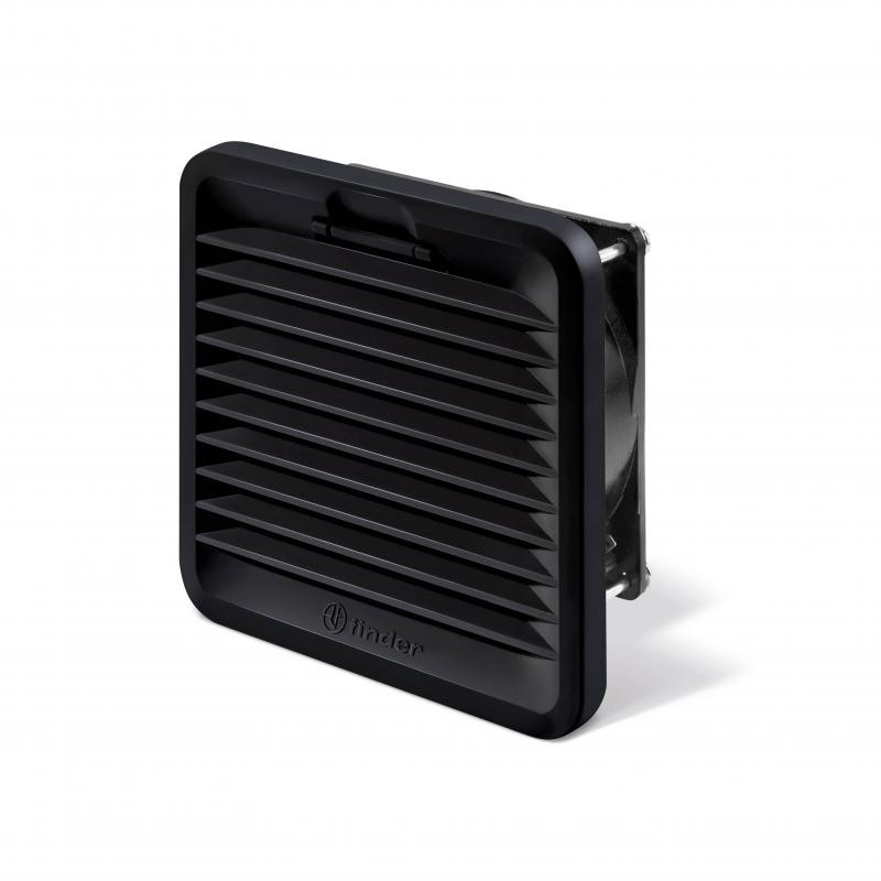 Description: Ventilateur à filtre taille 1, 230V AC, 24 m³/h, de couleur noir, puissance nominale 23W, bornes Push-in, IP54, température ambiance -15 à +55°C