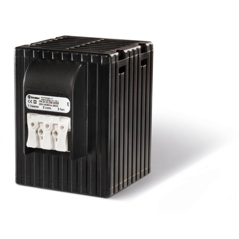 Description: Resistance chauffante 230V AC, 250W avec ventilateur 30 m³/h, IP20, limitation de température par sonde PTC auto régulée, bornes à cage, montage verticale sur rail 35mm, tempérautre ambiante de -40+50°C