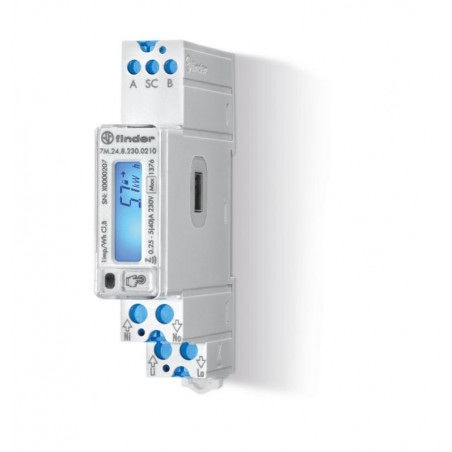 Description: Compteur d'énergie monophasé 5A nominal 40A maximum, 230V AC sortie émettrice d'impulsions SO +/-, affichage digital écran rétro-éclairé, classe 1/B, certifié MID, port de communucation MODbus, NFC et infrarouge