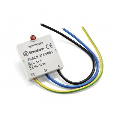 Emballage: 1 Marque: Finder Référence: 7P3282750005EAN: 8012823399478 Description: Parafoudre à encastrer T3 pour luminaire à led Un=230V in=5KA Uoc=10kV led de signalisation IP65