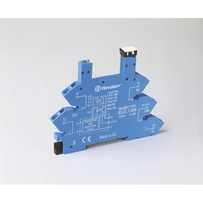 Description: Support 6A 250V 220 à 240V AC/DC, pour série 34, circuit de protection bobine et de signalisation intégré, de couleur bleue, étrier plastique d'extraction, 6,2mm, bornes à ressort, montage rail 35mm